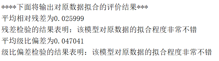 最后代码中输出的对原数据拟合的评价结果中有平均相对残差和平均级比偏差参考上文中的GM(1,1)模型的评价与检验: