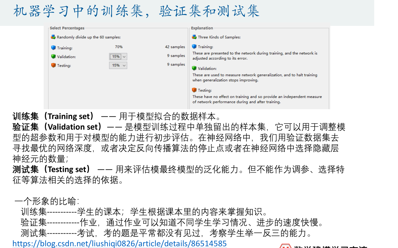Matlab在默认情况下训练集占数据集的70%,验证集占数据集的15%,测试集占数据集的15%