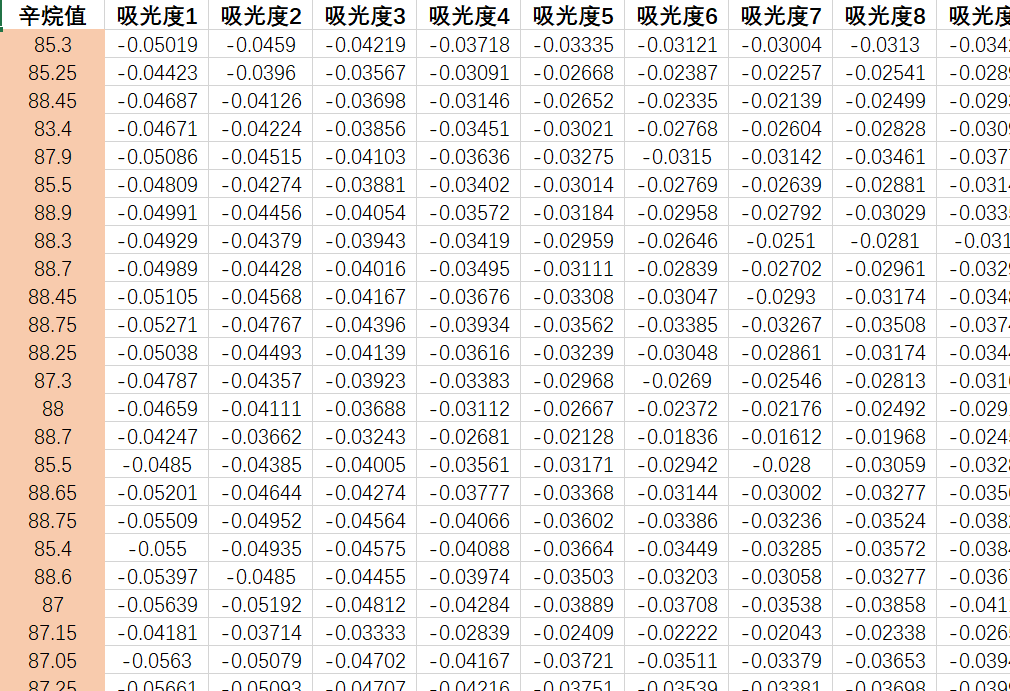 吸光度为X值(指标),辛烷值为Y(输出量),通过已知数据集训练,最后预测未知的辛烷值