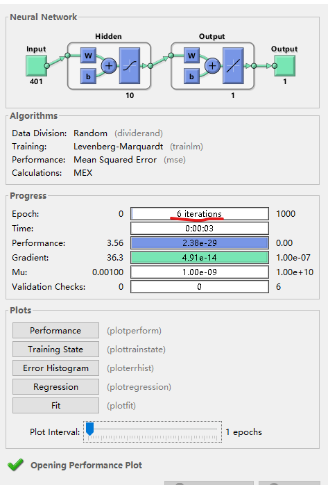 APP→Neural Net Fitting(神经网络拟合)→选择输入层输出层和样本所在行还是列→训练集,验证集,测试集所占百分比默认→隐藏层个数默认为10→选择训练方法(默认即可,选择的方法不同迭代的次数不同)→→→→→→→