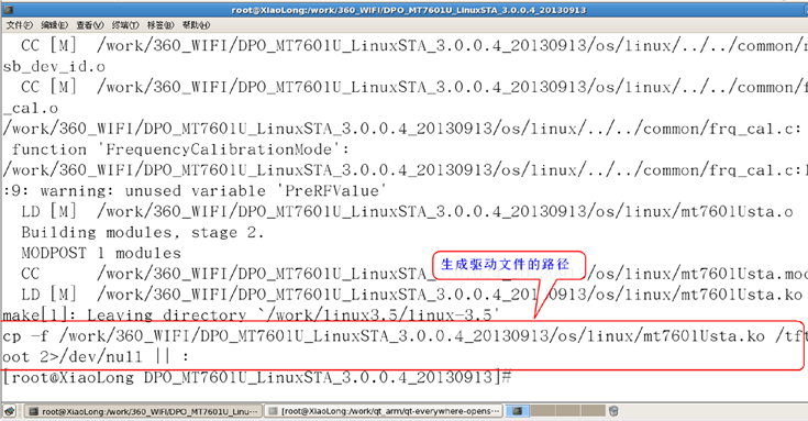 在解压的源码目录下编译源码,生成驱动文件。 (需要在解压的顶层目录下输入 make) 编译成功后,会在 os/linux/目录下生成 mt7601Usta.ko 文件。