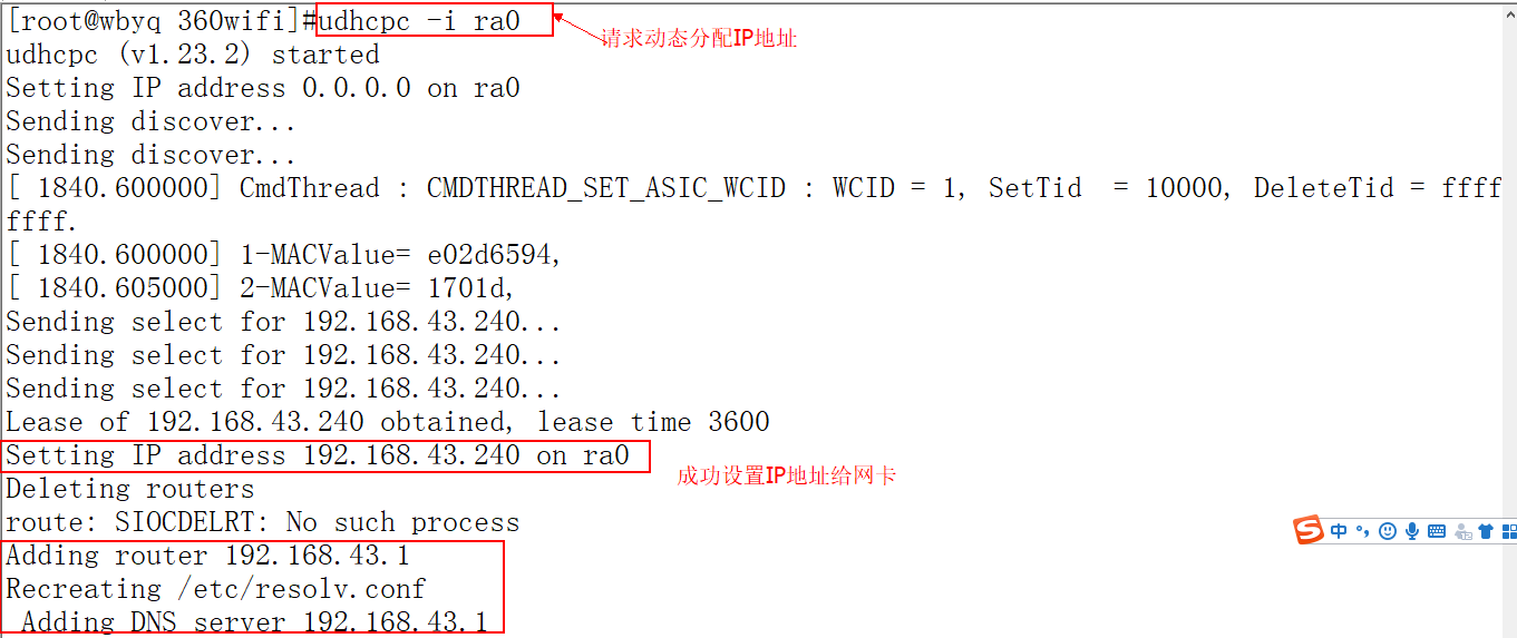 | 1. 将WIFI相关的工具库所需要的库文件和可执行文件拷贝到对应的目录(开发板根目录)下。 2. mkdir /var/run/wap_supplicant -p #创建网卡控制接口 3. 为了支持自动IP地址分配,拷贝所需要的文件到指定的目录下。 #创建自动获取IP地址的文件 mkdir /usr/share/udhcpc -p cp simple.script /usr/share/udhcpc/default.script -fv 4. 安装驱动: insmod mt7601Usta.ko 5. 启动网卡,并连接指定的热点: wpa_supplicant -Dwext -ira0 -c /etc/wpa_supplicant.conf -B 6. 自动分配IP地址: udhcpc -i ra0 |