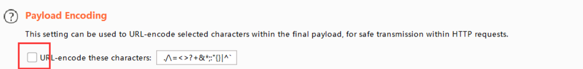 Burpsuite会自动将符号进行 url 编码,这里需要将 Payload Encoding 的勾给去掉
