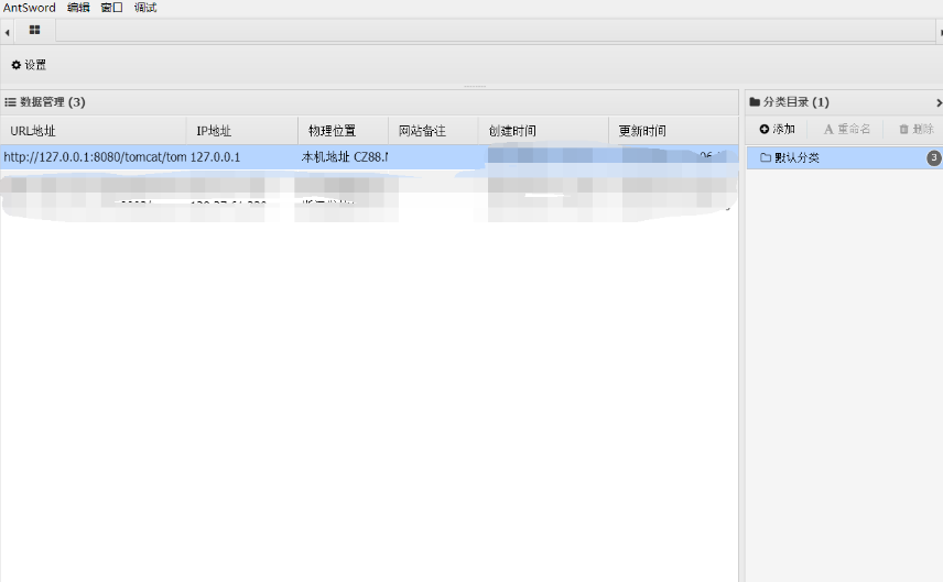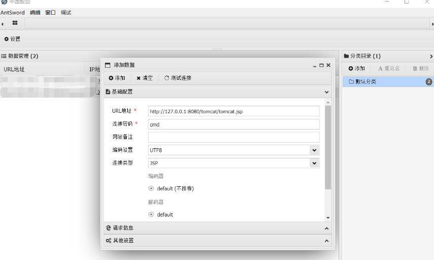 通过中国蚁剑添加数据,输入jsp木马中的密码cmd