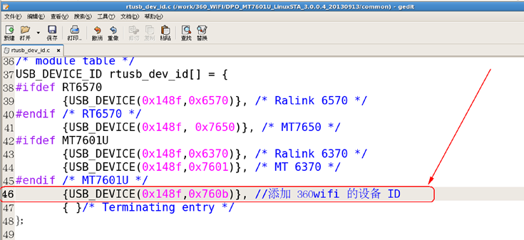 添加 USB 的 ID 需要修改 common 目录下的 rtusb_dev_id.c 文件,该文件里有一个存放 ID 的结构体,我们需要将上一步得到的 360WIFI 的 ID 添加到结构体中。