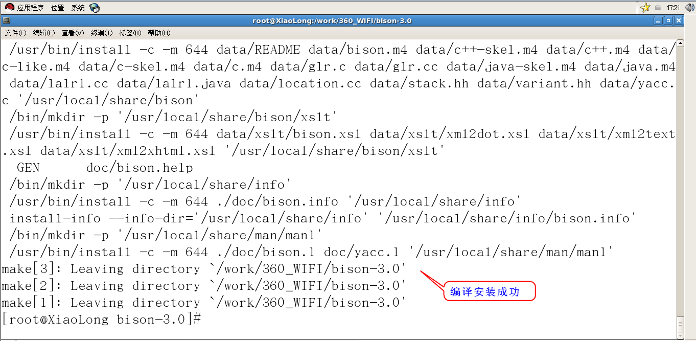 将下载好的bison-3.0 .tar.gz压缩包拷贝到虚拟机解压,解压后,进入到解压后的目录,配置,编译,安装。
