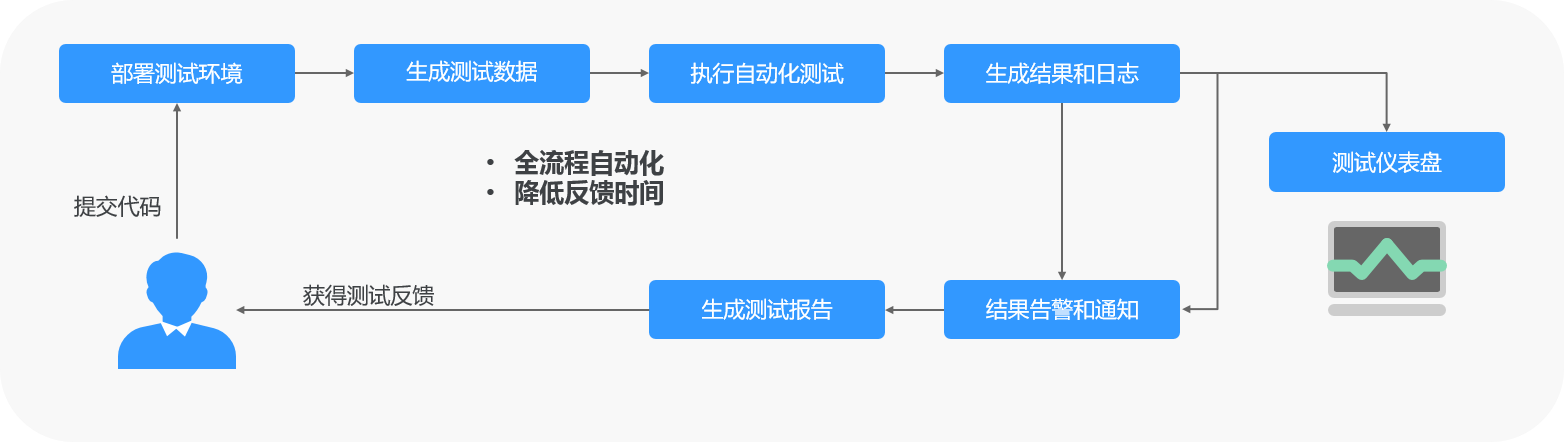 为了应对日益增长的产品需求与繁重的测试任务,提升测试质量和测试效率,测试团队会把测试专项能力向服务化能力转型,建立自动化为主的测试能力。测试自动化的目的为了减少手工测试和手工操作,如图2所示,测试自动化包括了自动化环境创建与部署、生成测试数据、执行自动化测试,生成测试结果与日志。并对测试相关结果进行自动化监控与分析,自动生成测试报告,以便进行测试定位失败原因与快速修复。