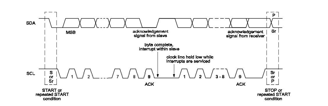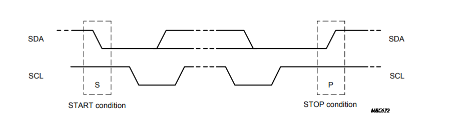 非应答信号:每个字节传输完成后的下一个时钟信号,在 SCL 高电平期间,SDA 为高,则表示一个应