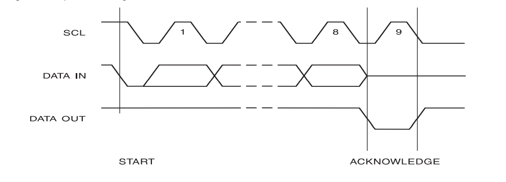 应答信号: 每个字节传输完成后的下一个时钟信号,在 SCL 高电平期间,SDA 为低,则 表示一个应