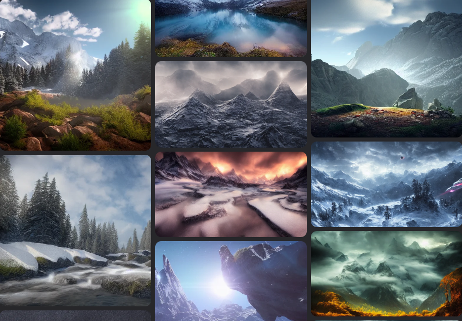 如果是简单的输入“大海”两个字,模型不知道我们想要的风景是什么样子的,一段作品的相对准确的描述,比如:梦幻的大海,白沙滩岸边铺满了粉色的玫瑰花,月光轻柔的人洒在海面上,绿色发光的海浪, 我们要去尽量用详细的语言,用细节清楚的描述我们幻想的场景。比如:云中的Skyrim风格的山,有一个照明螺栓击中尖端导致雪崩,山区风景。