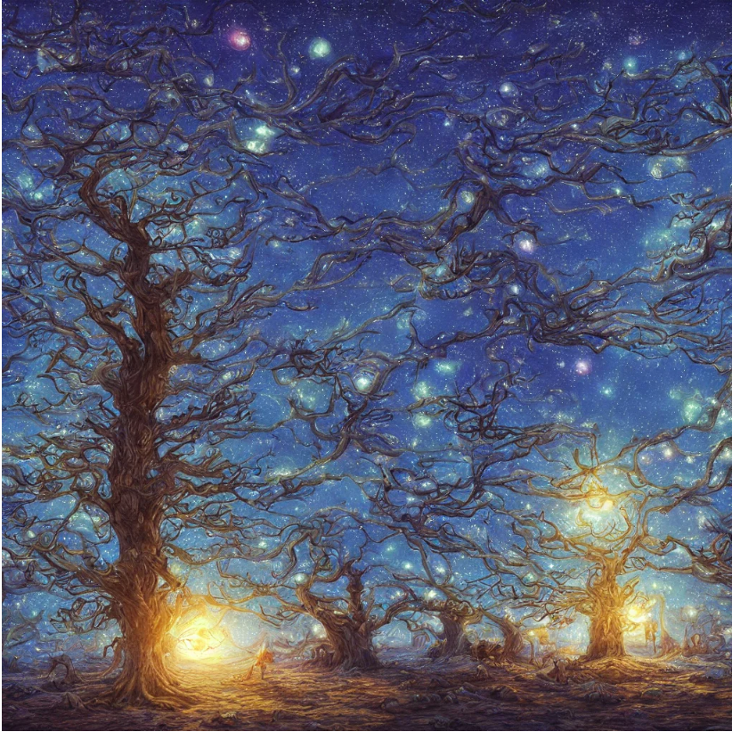 提示词:这是一幅美丽的画作,描绘了夜晚一大片空旷的沙漠沙丘,中间有许多棵神秘的巨大发光的蓝色树,树的蓝色光芒照亮了周围的环境,天空中的星星,由特德·纳史密斯和托马斯·金卡德创作。