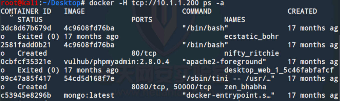 docker -H tcp://10.1.1.200 ps -a //列出所有容器