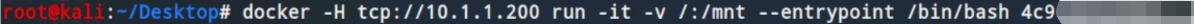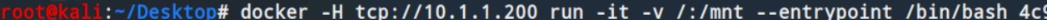 docker -H tcp://10.1.1.200 run -it -v /:/mnt --entrypoint /bin/bash 4c9608fd76ba