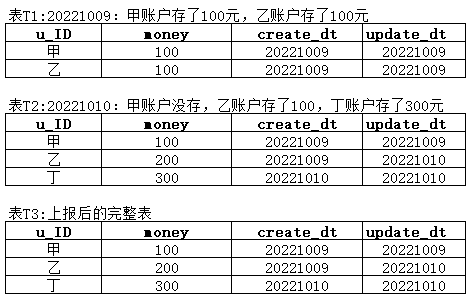 增量表,就是记录每天新增数据的表。比如:从9号到10号新增了哪些数据,改变了哪些数据,这些都会存储在增量表在10号的分区里面(下表中的create_dt 可作为分区字段)。