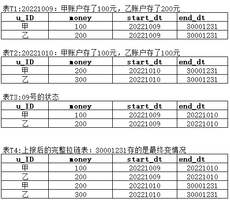 此时,如果对张表每天都保留一份全量,那么每次全量中会保存很多不变的信息,这对存储是极大的浪费;拉链表,既能满足反应数据的历史状态,又能最大程度地节省存储空间。