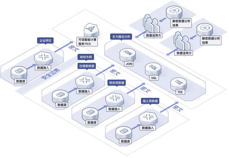 • 政府多委办局之间密文数据融合计算,实现多方数据的融合分析。