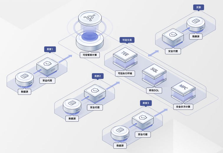 对接多种主流数据存储系统,为数据消费者实现多方数据的融合分析,参与方敏感数据能够在具有TEE安全支撑的聚合计算节点中实现安全计算。