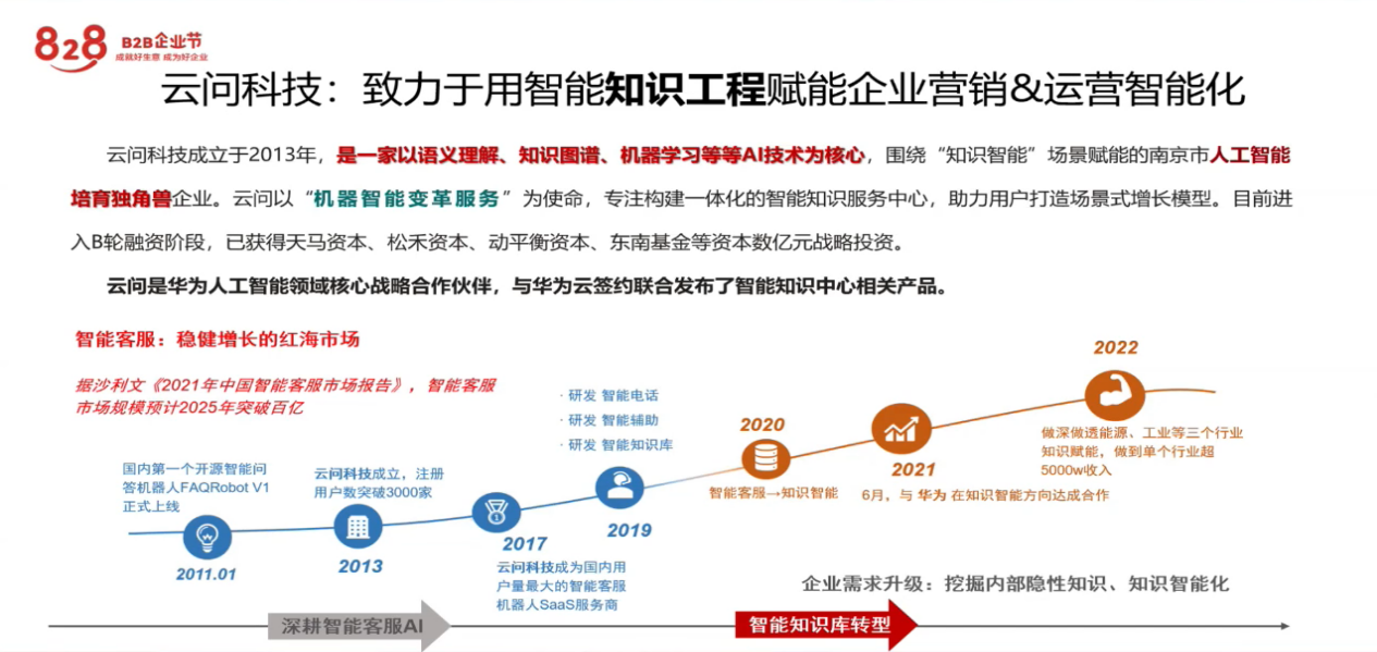 云问科技成立于2013年,是一家以语义理解、知识图谱、机器学习等AI技术为核心,围绕知识智能场景赋能的人工智能培育独角兽企业,云问科技以“机器理解变革企业服务”为使命,专注构建一体化的智能知识服务中心。从11年开始创建的国内第一个FAQ Robot的机器人,到后面逐渐完成了最大的智能客服机器人SAAS厂商;在19年的时候研发智能电话、智能辅助、智能知识库等相关产品。2020年企业从智能客服领域转型,做知识智能相关内容,并于2021年从华为与知识智能方向达成合作。在2022年的时候,云问科技已经深耕能源、工业等三个方向,做到单个行业超5000万的整个收入。
