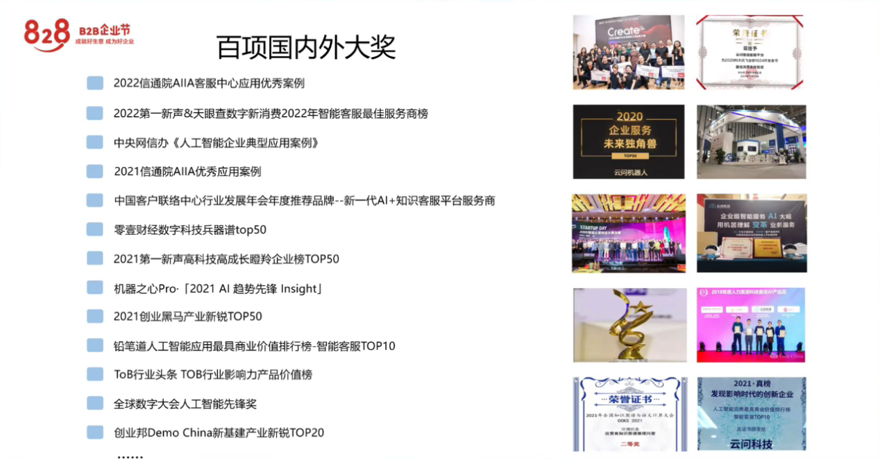 目前云问科技是华为人工智能领域的核心战略合作伙伴,与华为运营签署了联合发布智能知识中心相关产品,如下图所示是云问科技获得的一些国内外相关奖项,包含了信通院AI的整个应用优秀案例,也包含了相对应的创新获奖内容。