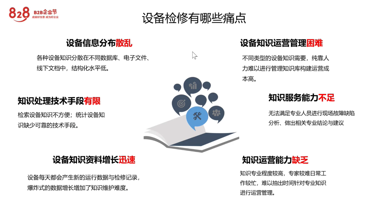 第二、设备知识的运营管理成本较高,那不同的类型的设备知识靠人力来去做整体的知识运营,目前这是一个现状。如何通过机器能去维护像维护设备,像维护ERP max一样去维护自己的知识,这套管理手段究竟是什么?这需要我们去进一步去思考。