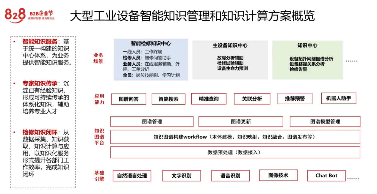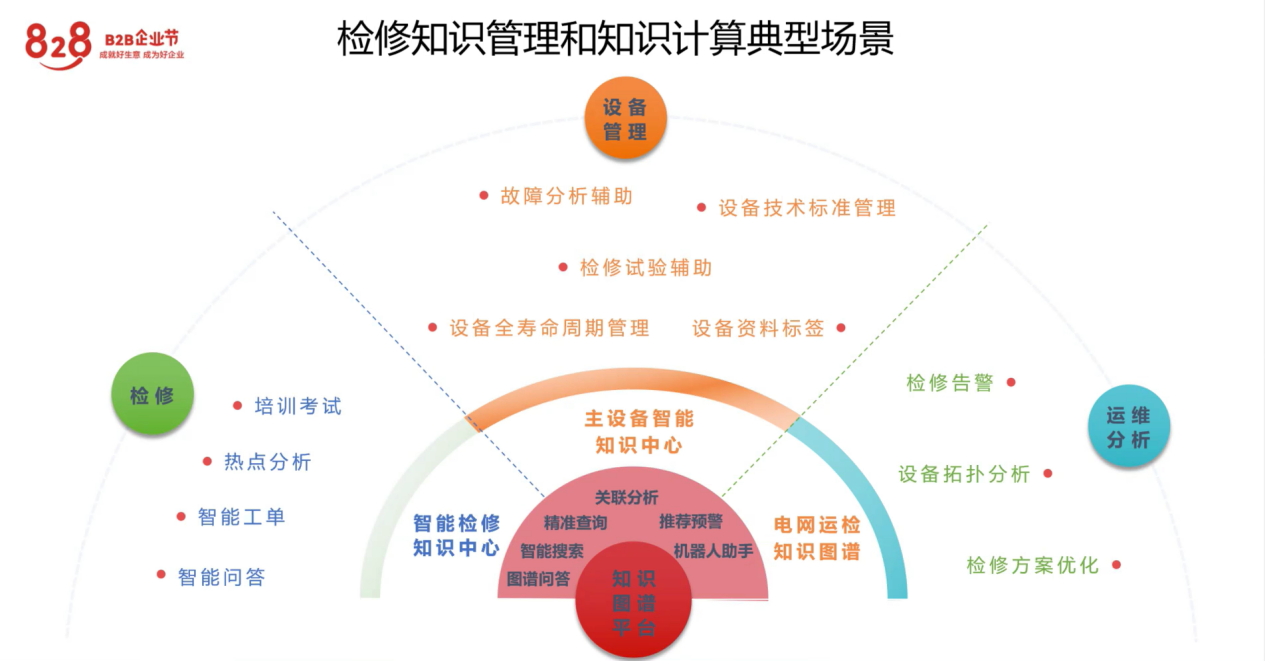 比如说在业务场景当中可以看到,比如说在检修的场景当中,我们要去做智能检修的知识中心,对于不同的人员有不同的服务方式,对于一线人员的话,要提供相对应的工作的终端,对于检修人员、业务人员,包括全员有自己的业务场景,由业务场景来完成整体的知识中心服务。