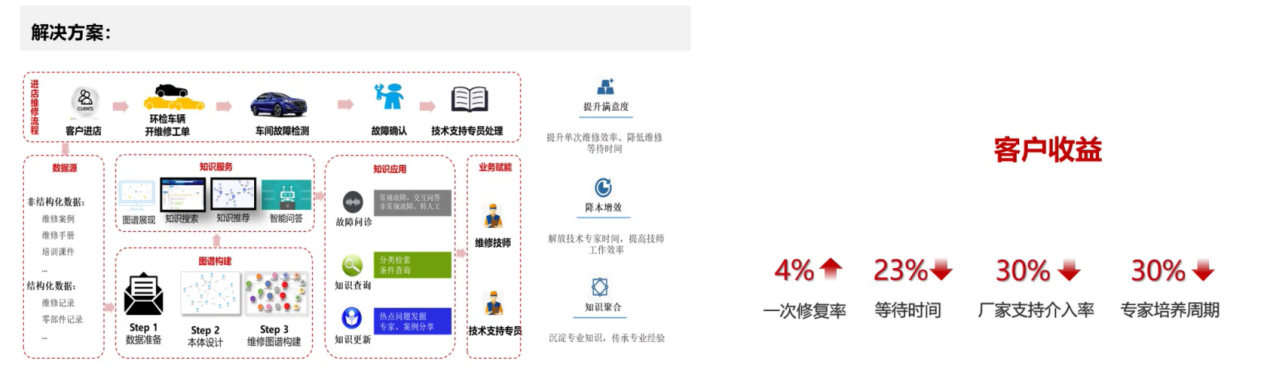 通过知识计算平台,让所有的业务人员,包括维修人员去使用之后,整体维修的一次修复成功率有4%的提高。同时我的基层员工对于知识反馈和响应的等待时间同比下降了23%,因为原来有很多问题要去问专家,那么现在通过这套系统,可以快速的去完成问题的一些问答。厂家支持的介入率,设备的生产厂家,他们原来需要去回答很多关于产品内容,通过对于厂家说明书的结构化分析之后,厂家支持率的介入也下降了30%,最后通过一些培训考试,让专家的整个培训周期也有30%的下降。