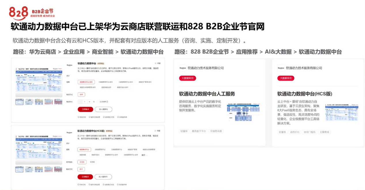 软通动力数据中台已上架华为云商店联营联运和828 B2B企业节官网,软通动力数据中台包含工业云和HCS版本以及配套的咨询实施和定制化开发以及运维服务。大家可以登录华为云商店,在企业应用商业智能的目录下,可以查找到软通动力数据中台产品HCS版本以及对应的人工服务,或者通过平台来搜索,可以直接进入到商品目录,登录828 B2B企业节,在应用推荐AI按照大数据的目录下,可以看到软通动力数据中台产品,HCS版本以及对应的人工服务,也可以通过平台的搜索功能进入到对应的产品。