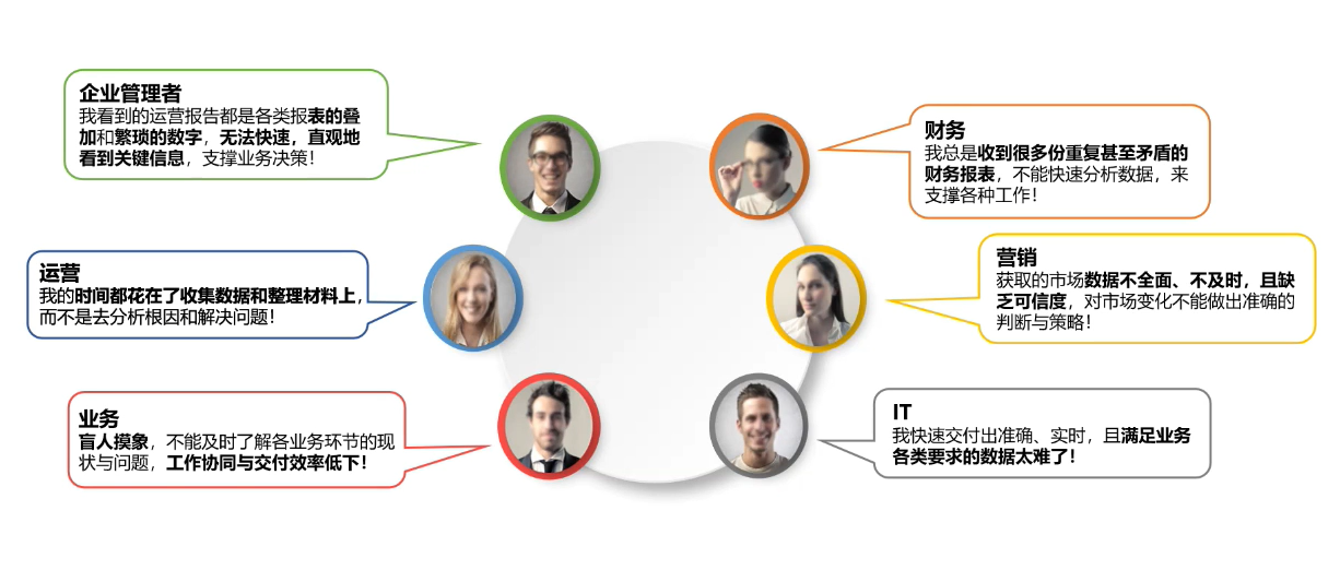 非常多的企业数据并未提供出有效的价值。对于企业的管理层,经常会面对繁琐叠加的报表数字,无法快速的去获取到自己的关键的业务信息,不能支撑业务的决策。对于企业的运营人员来讲,花了很多的精力在数据的整理上,而不是去分析问题和定位原因,对业务人员不能够及时了解上下游各业务环节的关键信息现状问题,导致协同以及交付的效率低下,对销售人员不能够全面及时的了解市场以及竞争对手的信息,对快速变化的市场不能做出准确的判断与策略。企业各层的管理人员,各个角色其实并没有真正感受到数据带来的便利性以及价值。