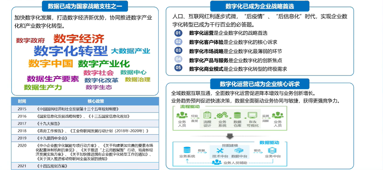 从2015年开始,国家开始大力稳步的推行数字化发展战略,特别是近三年讲数字经济,数字化转型,大数据产业,数据生产要素,已经成为当前最高频的热词。