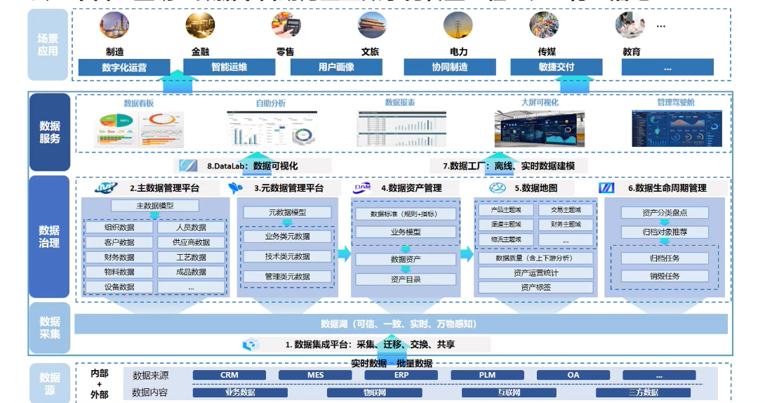 通过基于主数据管理平台,实现各个应用系统之间共享的基础数据,如客户、供应商、会计科目、产品物料、会计编码,统一的管理、编码和规范,并且构建数据中心中枢实现统一的采集,管理以及分发,达成了就是同一个企业同一套数据来促进数据打通数据全院那个全域的数据孤岛,基于数据原数据管理平台,实现技术业务管理三类的数据统一的采集管理,构建企业数据管理体系的基础,基于数据资产管理平台,形成企业统一的资产目录,将零散的数据转化成可信的数据资产,实现企业数据的资源化资产化的管理。基于数据图,然后面向一线的业务用户,体现提供高效数据的数据检索,以及数据消费的能力,然后属于基于数据生命周期对企业冗余的数据进行智能化的推荐,自动化的归档及销毁,来节省数据的存储空间,提升数据资产的效率。