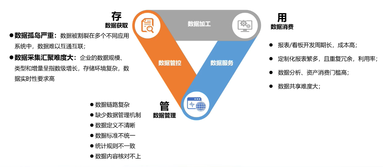 究其本质,企业面临的数据存管用的共性的难题。在数据的获取方面,由于信息化时代烟囱式的建设导致数据被割裂在不同的应用系统,然后造成了全域的数据孤岛。然后同时企业的数据的规模大类型多,而且增量的数据日益剧增,存储环境复杂,同时实时的要求比较高,造成了数据采集汇聚的难度比较大。