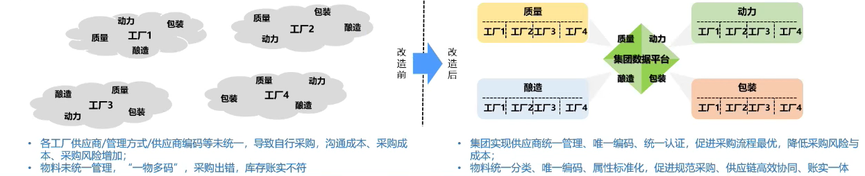 - 信息化阶段业务系统烟囱式建设,工厂供应商、物料、工艺等核心数据标准规范不统一,导致集团全域数据壁垒;