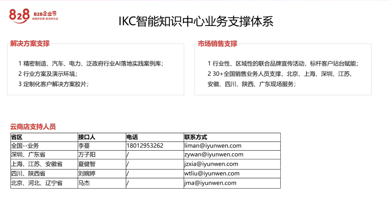 同时云问科技的支撑方案是主要聚焦于精密制造、汽车、电力、泛政府行业的相关的AI落地实践案例行业方案,同时基于客户的场景会做相对应的知识服务定制。在市场方面的话,目前提供了整个行业性区域性的联合解决方案,并在30个城市有相对应的销售覆盖。如图所示下面是整个商场的商城资深人员。