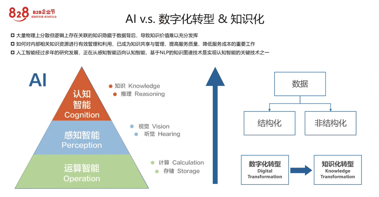 在认知智能的计算范畴当中,我们发现在这里面有知识,包括知识与推理的相关的模块,通过相关模块,相较于传统的感知层的计算,认知层会更多的会考虑到知识和推理本身的相关内容。目前聚焦的方向就是由数字化转型往知识化转型的发展变化,数字化转型更多会考虑如何把所有内容云上信息化,让云上信息化的数据如何发挥价值。大多数企业和用户关注的不是数据本身,而是数据背后的知识。如何把数据转换成知识,这就是我们需要去考虑的核心内容。在数据方面,我们的重点在结构化和非结构化数据当中如何去处理相关数据,其核心技术就是以自然语言处理知识图谱的相关技术,这是目前实现认知智能的核心关键技术。
