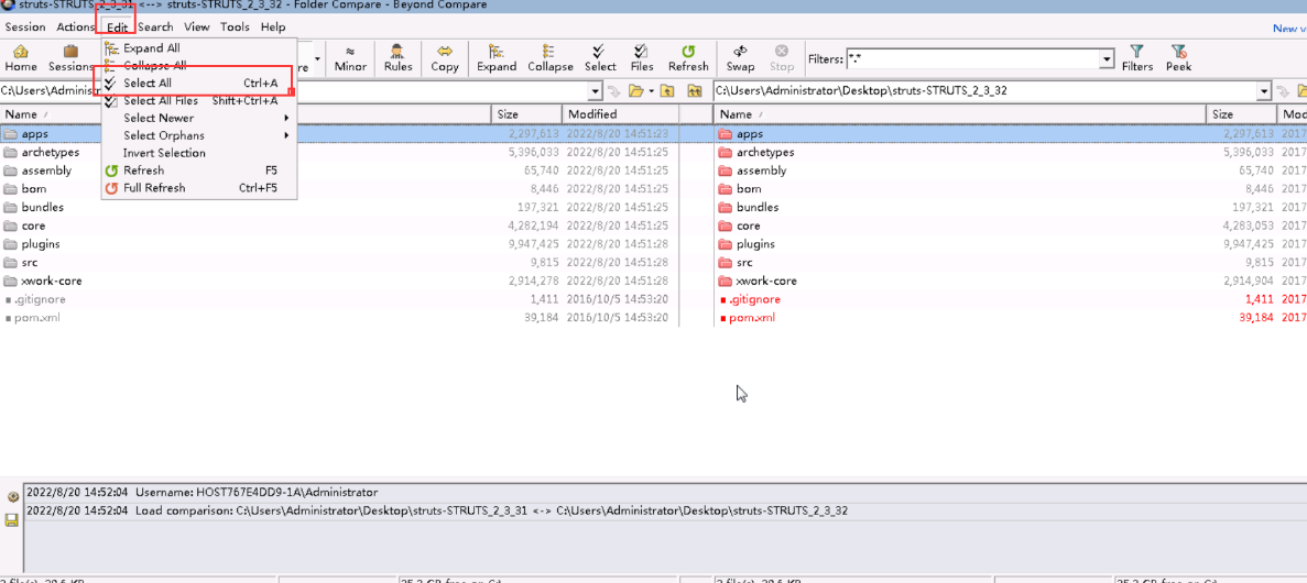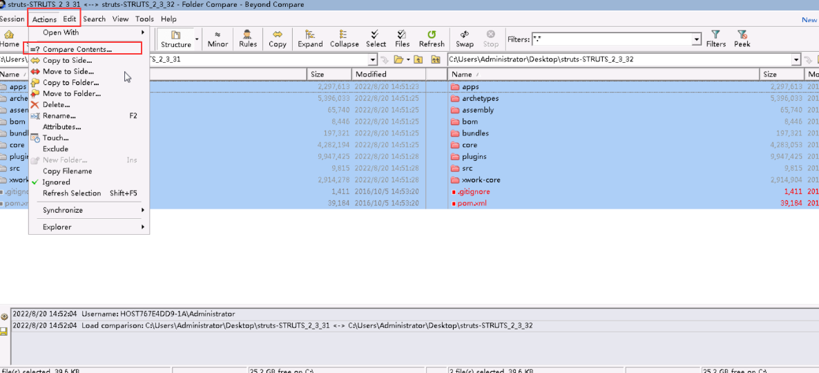 然后点击菜单栏的Actions,然后选择Compare Contents