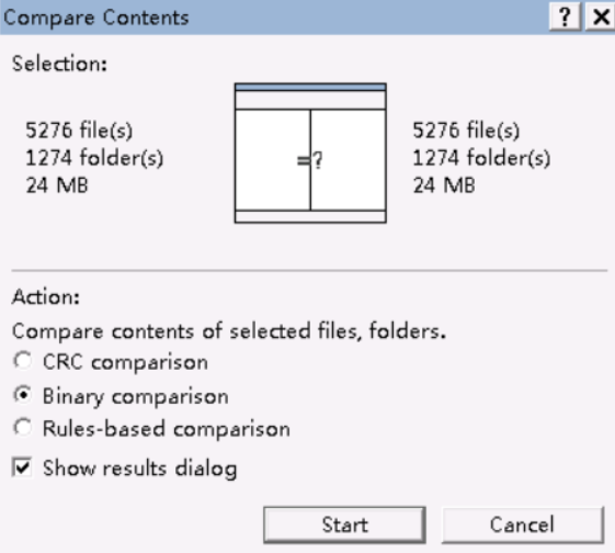 在弹出的弹窗中选择Binary comparison ,并勾选Show results dialog ,点击start等待比较完成