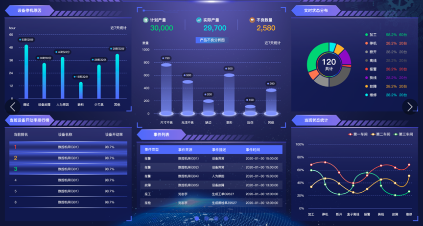 - 针对CNC生产车间内的CNC设备,实现透明可视,包括产量实时、设备综合效能/运行状态等。