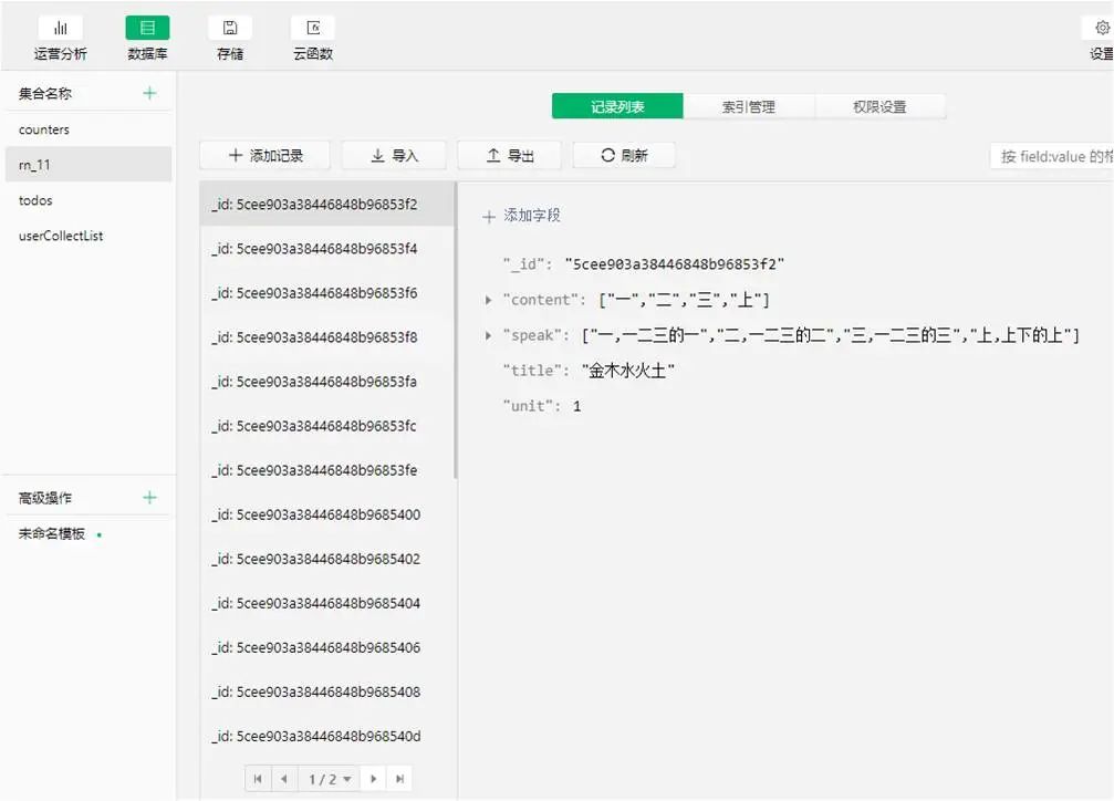 添加完插件后再进行重新编译,会发现还有报错,原因是云开发数据库里没有需要的课本对应的数据记录,因此需要进行数据库的导入。数据库文件具体如图四所示。其中,rn_11对应的是一年级上册的听写数据,rn_12对应的是一年级下册的听写数据,以此类推。