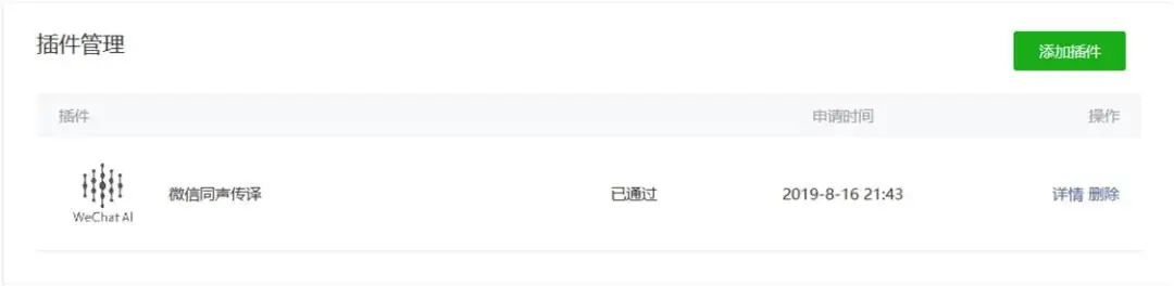 听写好助手的代码中使用了微信同声传译的插件,这是由于听写好助手需要将存在数据库中的文字转换成语音,要让代码正常跑起来,需要登录微信公众平台,在“设置”→“第三方设置”→“插件管理”中,添加插件“微信同声传译”,添加插件后,如图3所示。