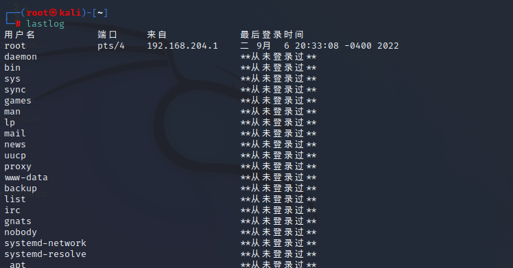 - lastlog (查看所有用户最近登录的时间)
