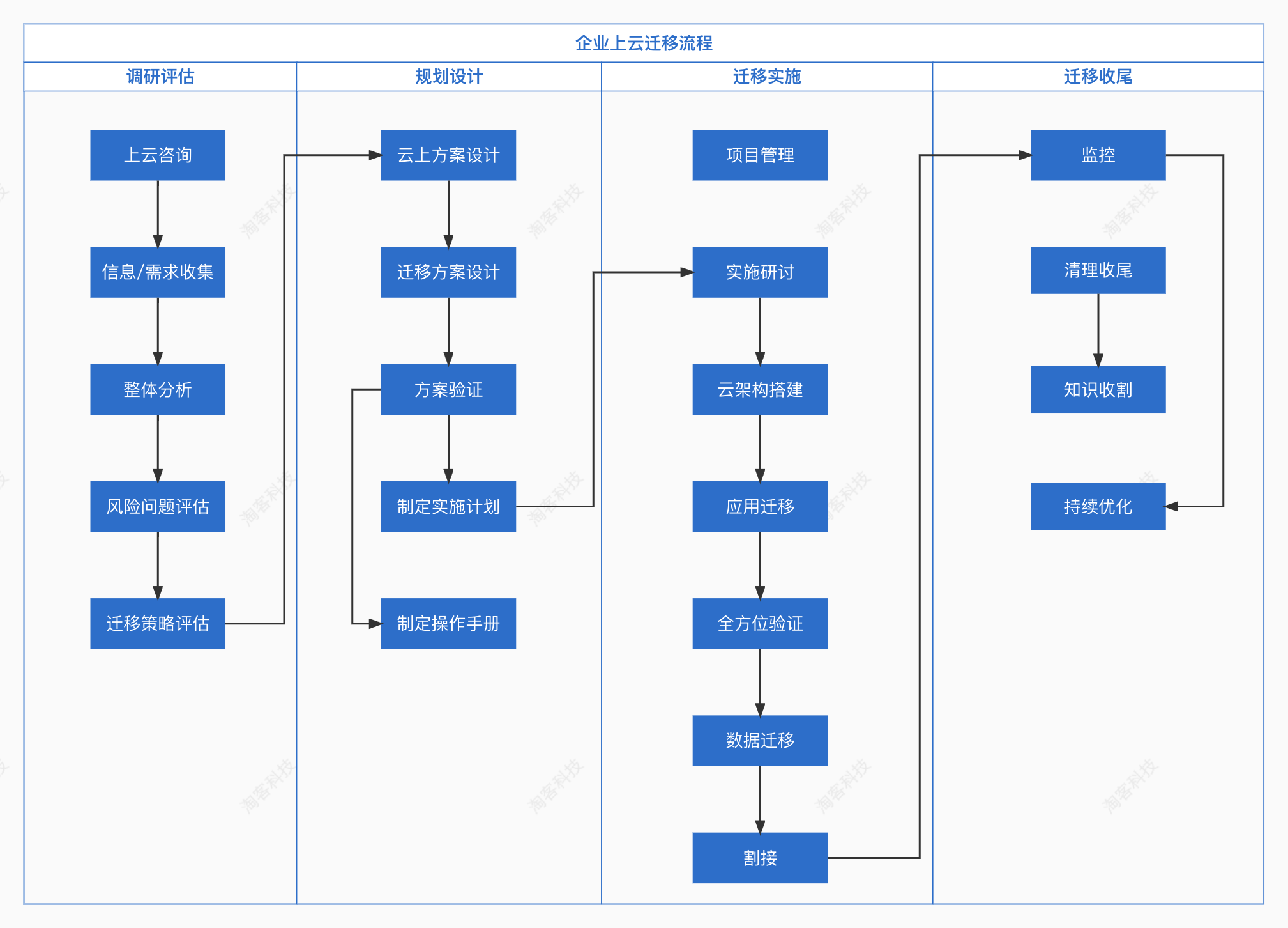 然而,迁移上云并非易事,这就需要有好的方法论和流程来规避迁移过程中可能产生的风险,保障迁移工作的质量,今天我们就来介绍一下企业迁移上云的基本流程。