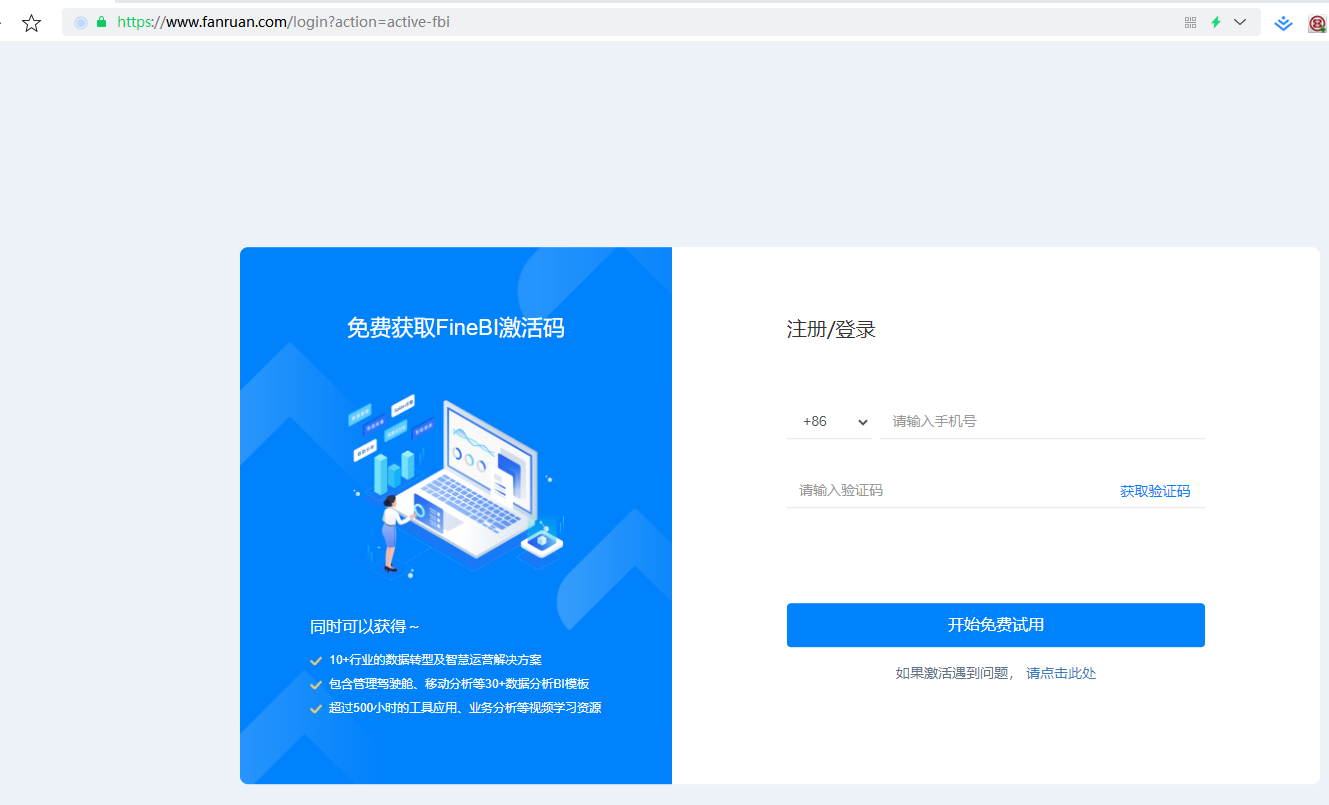 输入手机号,获取验证码,点击开始免费试用的按钮: