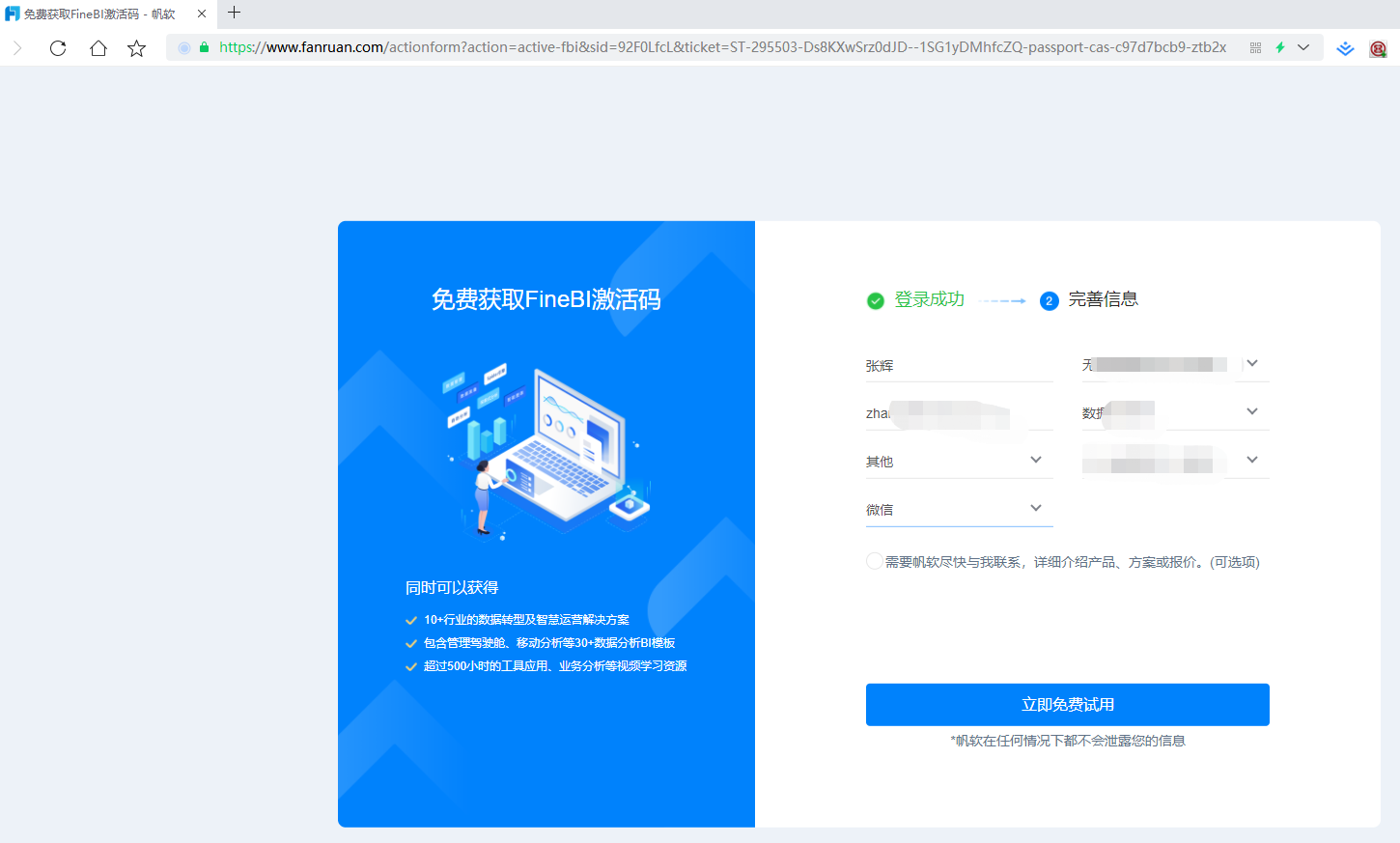 根据要求输入个人信息,点击立即免费试用,系统会弹出二维码,让你关注公共号: