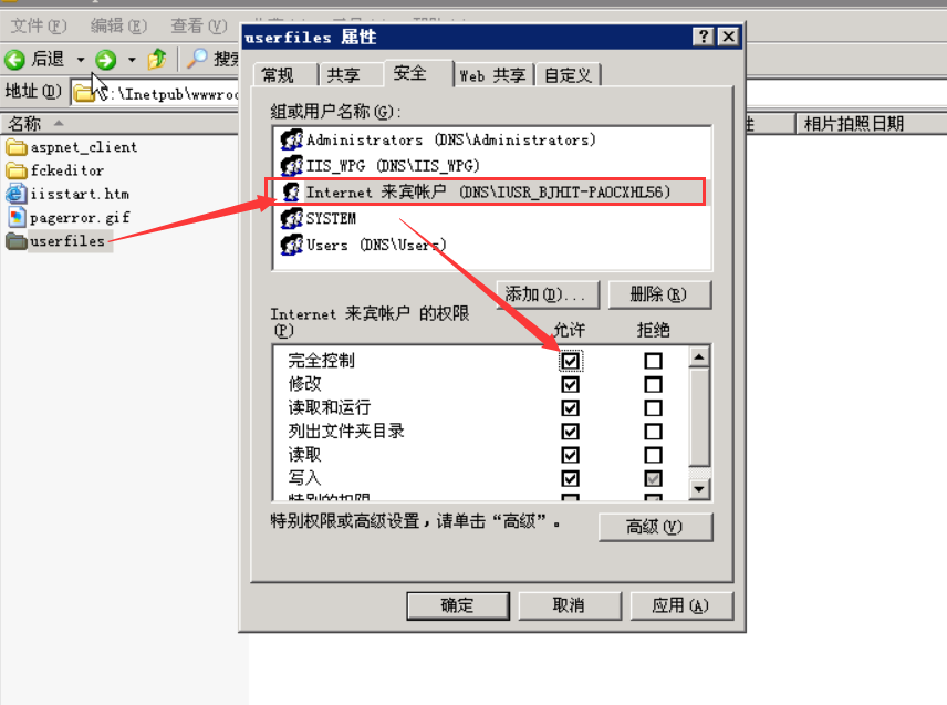 配置userfiles目录对来宾账户具有读取、写入、运行权限。