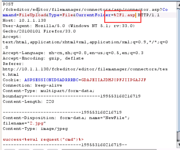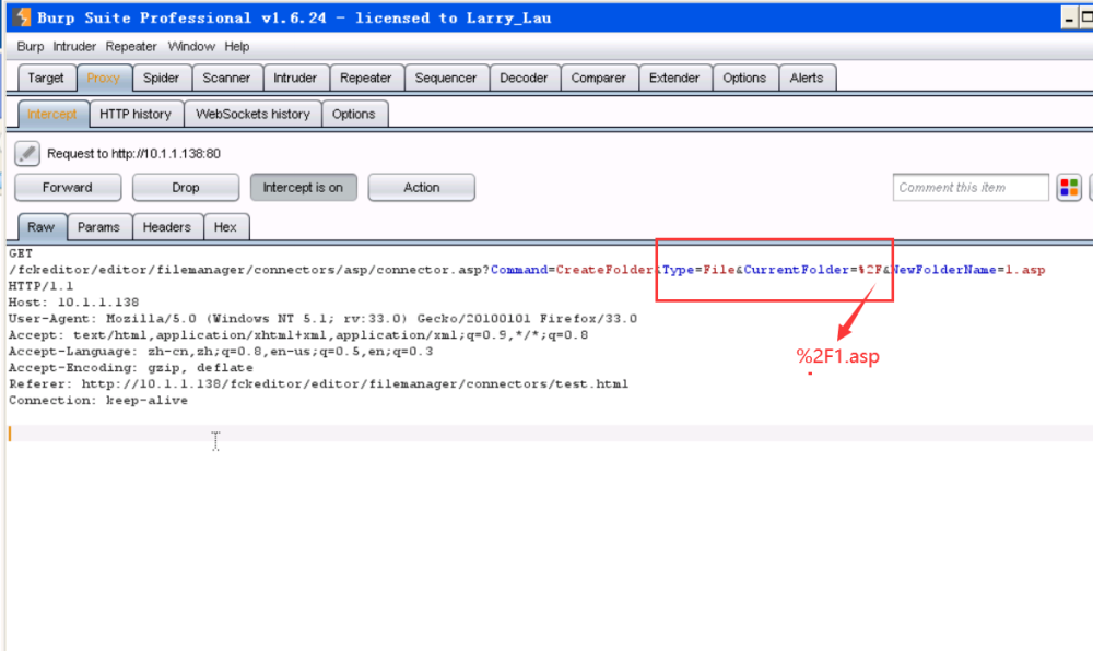 接着,在burpsuite中修改数据包,将“CurrentFolder=%2F”修改为“CurrentFolder=%2F1.asp”。