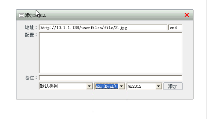 运行caidao.exe(即中国菜刀),分别输入shell的链接http://10.1.1.138//userfiles/file/1.asp/1.jpg,菜刀的连接密码为cmd,脚本类型为ASP(Eval),最后点击“添加”,即可新建一个菜刀的链接。双击该链接,就可浏览目标服务器上的文件。