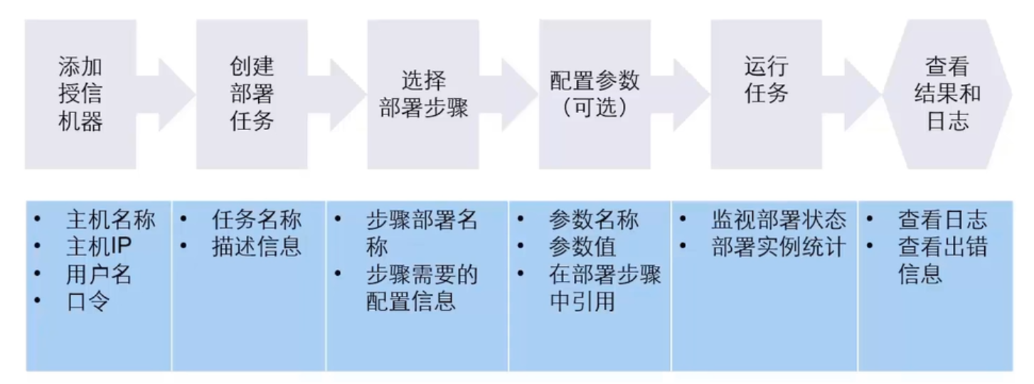 部署任务由原子步骤自由组装编排,免去写脚本实现部署过程,降低门槛。