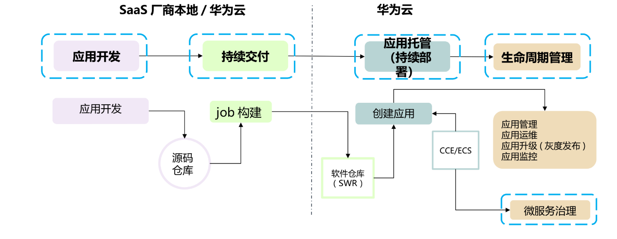 1.应用开发与持续交付可以放在SaaS厂商或客户侧,应用托管和生命周期管理在华为云上
