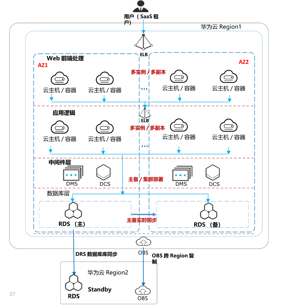 3.数据库等服务的主备节点分别双AZ部署,可以使用DRS实现数据跨Region(两Region相隔10OOKM)准实时备份;